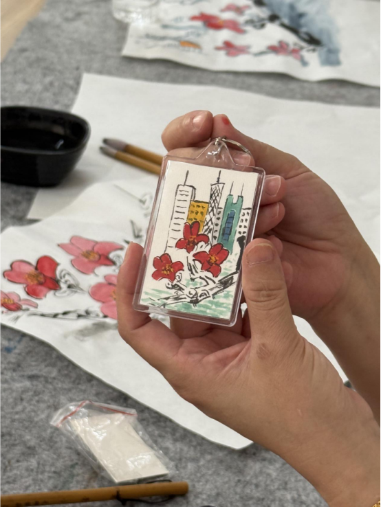 活动以“小尺寸大意境”为核心理念,将广州塔、五羊雕塑、猎德大桥、永庆坊月亮桥等城市地标融入国画创作。第一期舒象厚老师以焦墨技法细致描绘广州塔流畅的曲线结构,钢筋铁骨在宣纸上化作灵动线条,展现现代建筑的艺术张力;第二期绘画“五羊雕塑”,以淡墨铺底、重彩点睛,刻画历史厚重感;第三期捕捉猎德大桥弧线之美,飞白笔触展现钢索灵动,凝练“横跨珠江”的气势;第四期以“桥下流水、月映江心”为意境,花青点染水面,留白营造永庆坊月亮桥的诗意。“羊城建筑+国画”的跨界融合,用传统笔墨为城市地标赋予温润生命力。完成后的作品不仅成为个人珍藏的艺术品,更被转化为实用性文创产品——挂饰、钥匙扣、微型框画等,既可随身携带,也成为居民讲述城市故事的独特载体。艺术由此走出课堂,融入日常场景,实现从审美体验到生活美学的自然过渡。