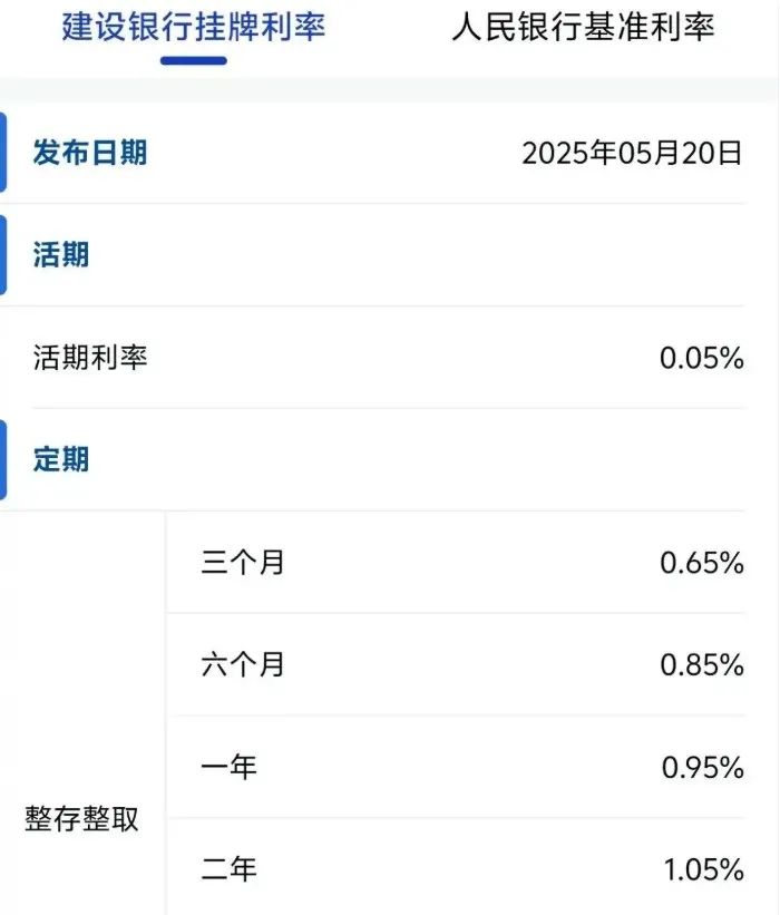 在此之前,中国建设银行(601939)、招商银行(600036)同步宣布下调人民币存款利率,在其官方App或网站调整了人民币存款利率表。其中,活期存款下调0.05个百分点至0.05%,各期限定期存款挂牌利率下调0.15-0.25个百分点。具体来说,3个月、6个月、一年期、二年期定期存款挂牌利率均下调15个基点至0.65%、0.85%、0.95%和1.05%,三年期和五年期定期存款挂牌利率均下调25个基点至1.25%和1.30%,调整前上述期限定期存款挂牌利率分别为10.8%、1.00%、1.10%、1.20%、1.50%和1.55%。